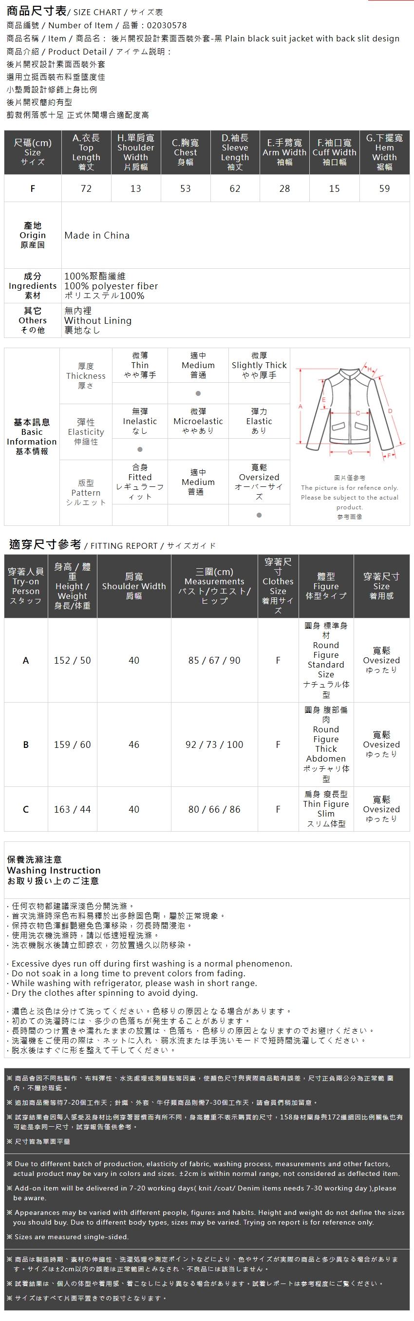 Plain suit jacket with back slit design - Black【02030578】in stock+pre-order