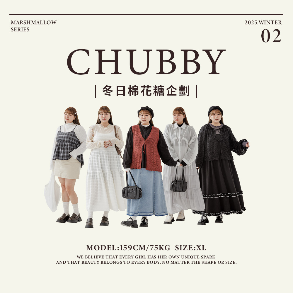 今年春天大受好评的棉花糖系列,延续推出秋冬服饰囉! 我们相信每一位女孩,都有专属于自己的闪光点,无论何种身形都有追求美丽的权利 不论你喜欢甜美、率性,还是嚮往日系或韩系风格,只要找到适合自己的版型与搭配技巧,就能不用牺牲舒适度,达到修饰身形与显瘦的效果 现在就一起来看看棉花糖系列单品,探索那些能让你自信发光的单品吧~ 麻豆 Sheena(棉花糖) 159cm/75kg 肩宽39cm 42.5/36/44 穿著XL号镂空花边针织绑带背心 M/L/XL 选用富有质感的纱线织成 具备弹性并有良好的保暖效果 胸前绑带可自行调节,花型下摆收边更可爱剪接虚边设计牛仔长裙 S/M/L/XL/2XL 耐磨高磅数棉质丹宁布 高腰设计加上后鬆紧调节,整体实穿性加倍 A字版型打造显瘦腰臀比 两侧抽皱设计透肤衬衫 M/L/XL 天丝棉混纺面料,触感柔软滑顺 伞襬版型呈现有腰身的视觉感 增加了服装的随性感和多变性光泽剪接伞襬长裙 M/L/XL 採用雾面光泽微透肤面料 摆动带有闪亮且飘逸的视觉效果 蛋糕裙襬呈现出甜美、优雅等多种风格 立体缇花高领长袖上衣 M/L/XL 选用泡泡感压纹面料 带有精緻木耳边细节 提升造型层次感与甜美气息格纹伞摆罩衫背心 M/L/XL 选用微磨毛感格纹面料 复古格纹,经典又充满秋冬气息 修饰身形并增加甜美感灯心绒直纹纹理短裙 S/M/L/XL/2XL 棉质灯芯绒,触感温暖舒适 独特条纹纹理提升层次感 高腰A字版型完美修饰身形 直纹缇花中山领衬衫 M/L/XL 选用带垂坠感的细棉麻混纺布料 宽鬆版型营造休閒随性感 与下摆呈现蓬鬆感及浪漫氛围花花透纱细肩长罩衫背心 M/L/XL 选用轻盈透气网纱材质 胸前褶皱设计堆叠出立体感,拉伸力大好穿脱 手绘花花搭配可爱撞色设计超亮眼 撞色木耳边斜剪接内搭上衣 M/L/XL 选用轻薄透肤网纱布料 带有优良弹性,贴合身形 撞色木耳边增添柔美与俏皮感毛感格纹肌理侧绑带长外罩 M/L 细腻缇花布料呈现羽毛纹理 垂坠的蛋糕裙摆与裙身两侧绑带 增加飘逸感和甜美气息 缇花澎袖绑带长袖罩衫 M/L 选用立体缇花雪纺材质 领口抽皱设计与双绑带呈现甜美感 衣长及臀部上缘,让整体比例更佳撞色木耳边伞襬细肩长洋装 M/L/XL 布料亲肤有弹性,垂坠度佳 微宽鬆版型,提供舒适的穿著体验 裙襬撞色多层荷叶滚边设计,层次感丰富甜美 《棉花糖系列下身尺寸参考》