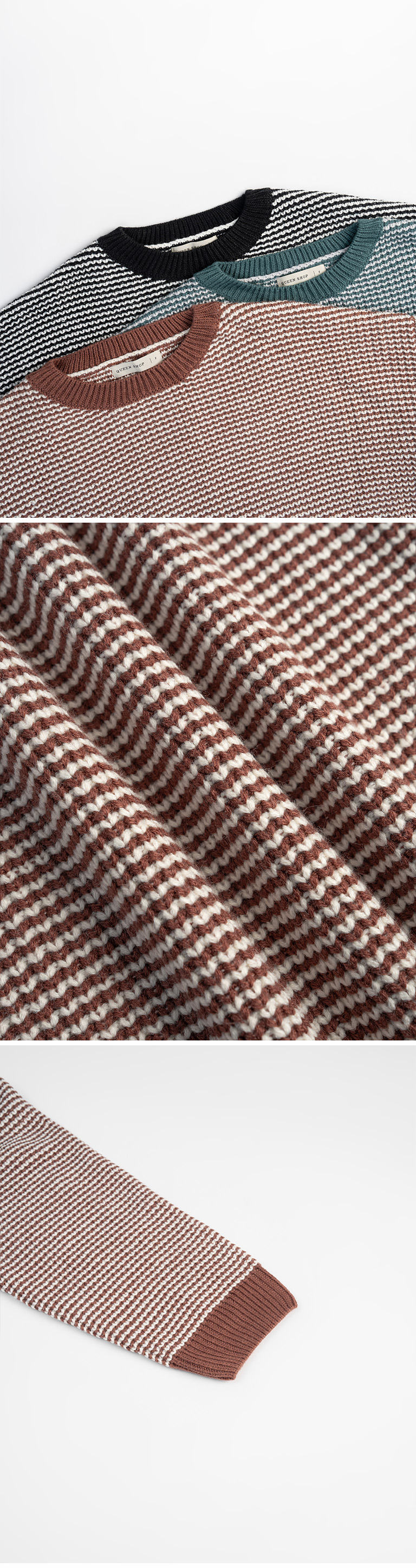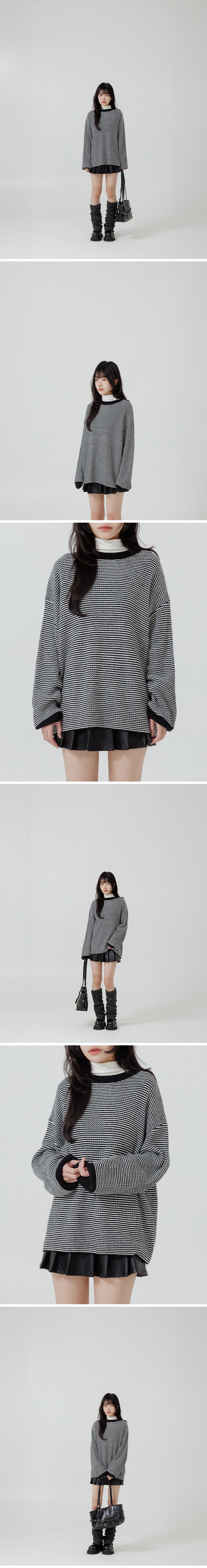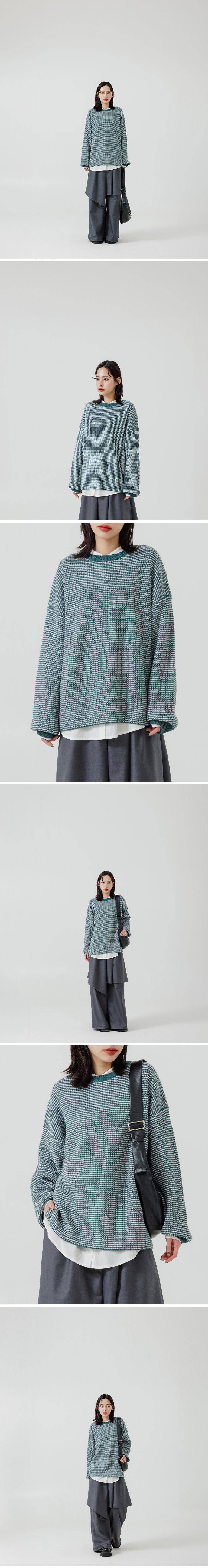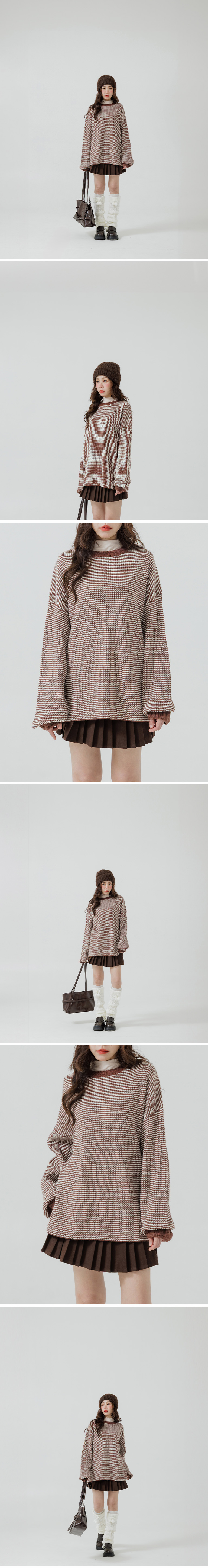 配色细格圆领宽版针织毛衣