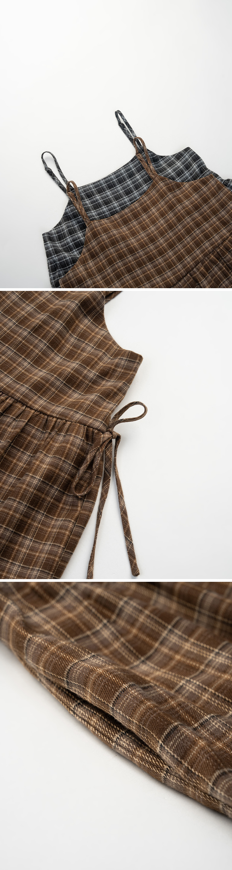 格纹侧绑带细肩长洋装