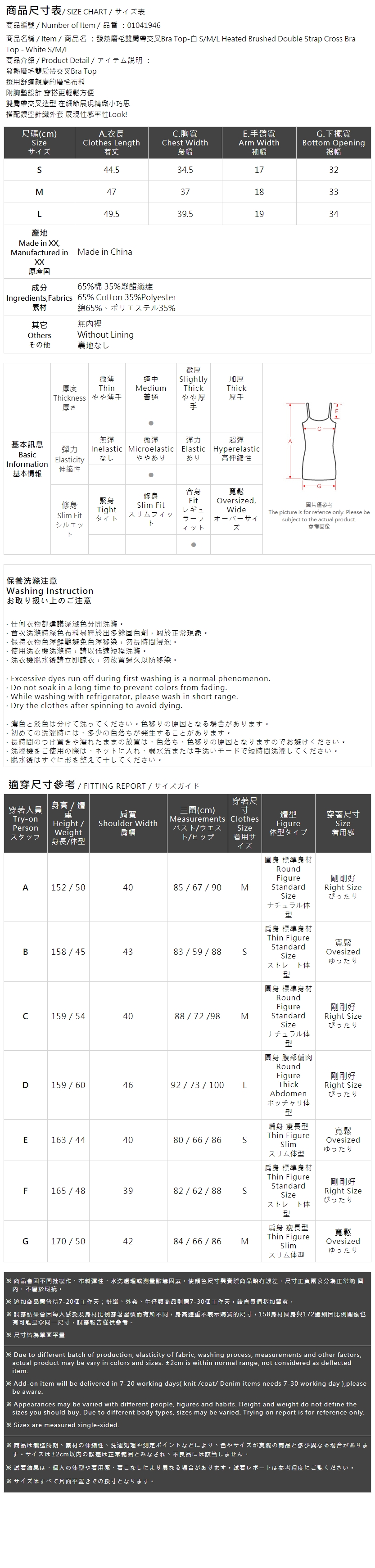 发热磨毛双肩带交叉Bra Top-白 S/M/L【01041946】现+预