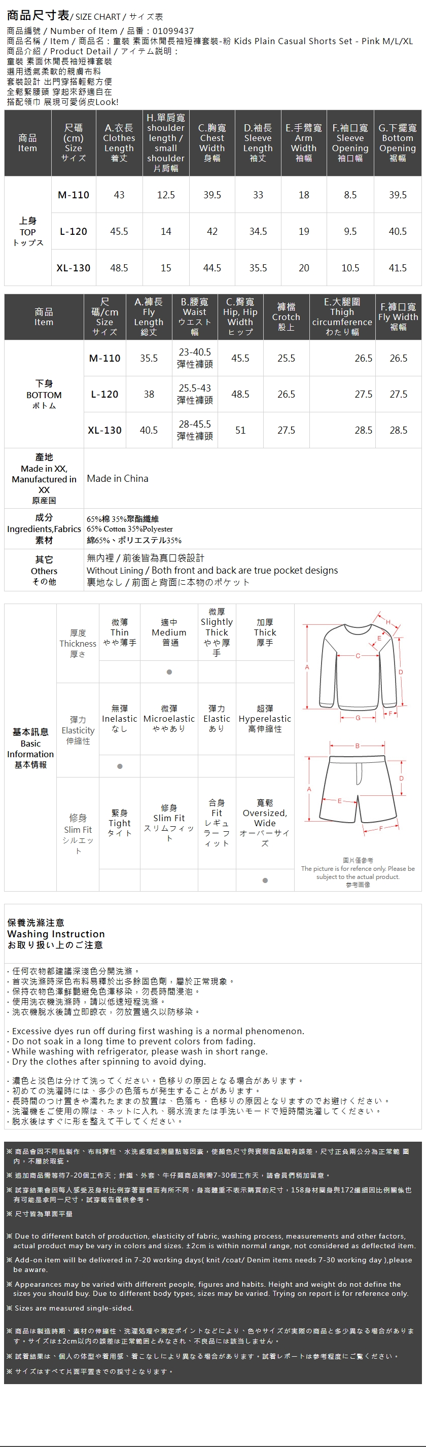 Kids Plain Casual Shorts Set - Pink M/L/XL【01099437】in stock+pre-order