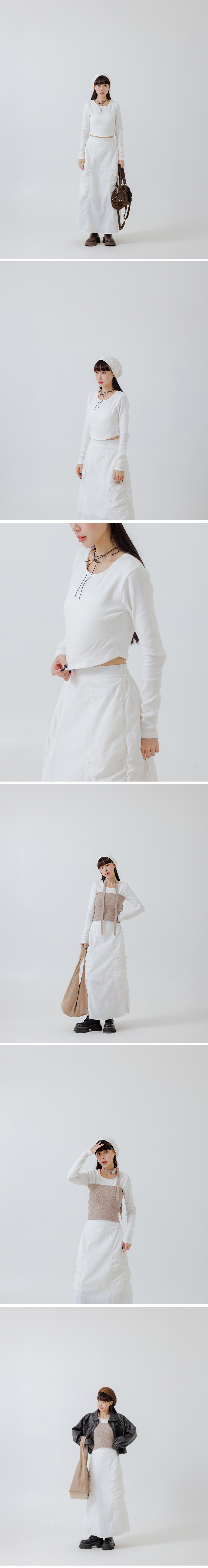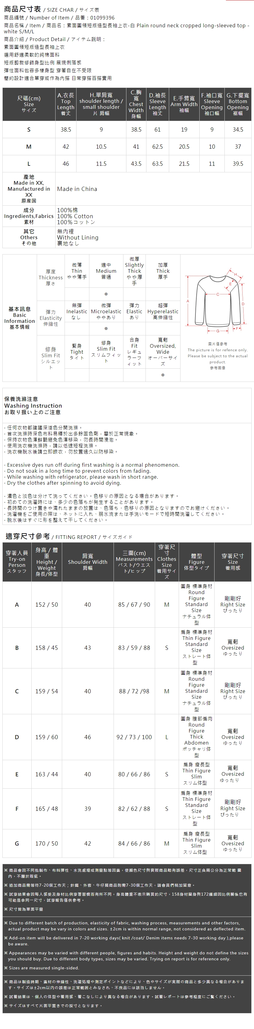Plain round neck cropped long-sleeved top - white S/M/L【01099396】in stock+pre-order