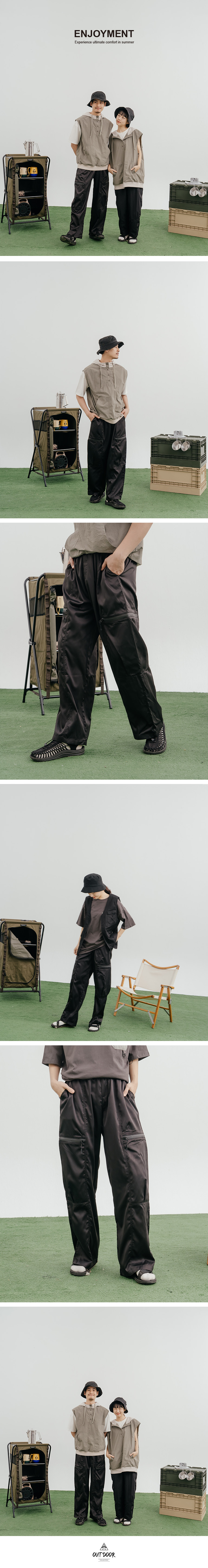 光泽侧拉链口袋打褶剪接长裤