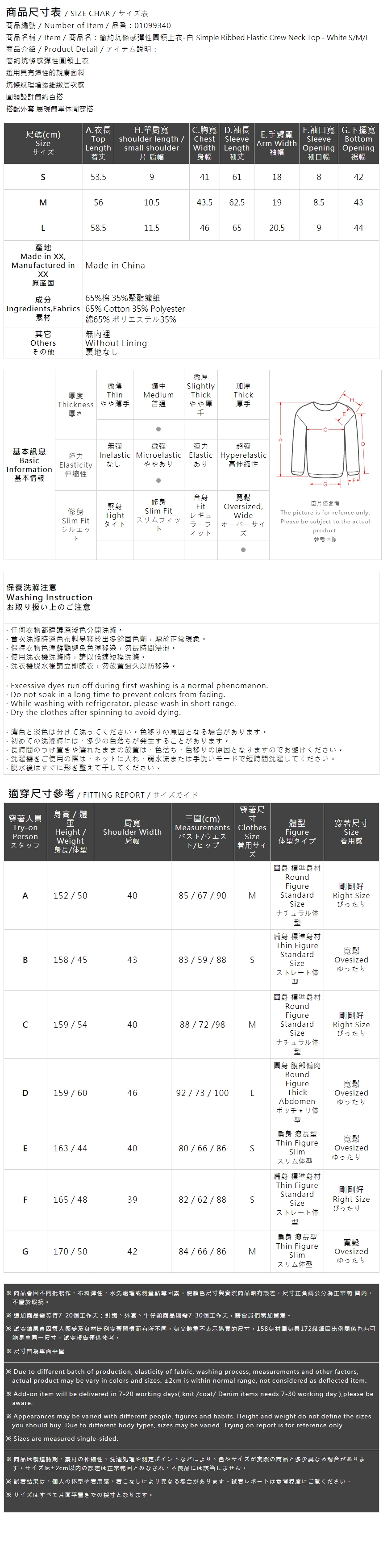 Simple Ribbed Elastic Crew Neck Top - White S/M/L【01099340】in stock+pre-order