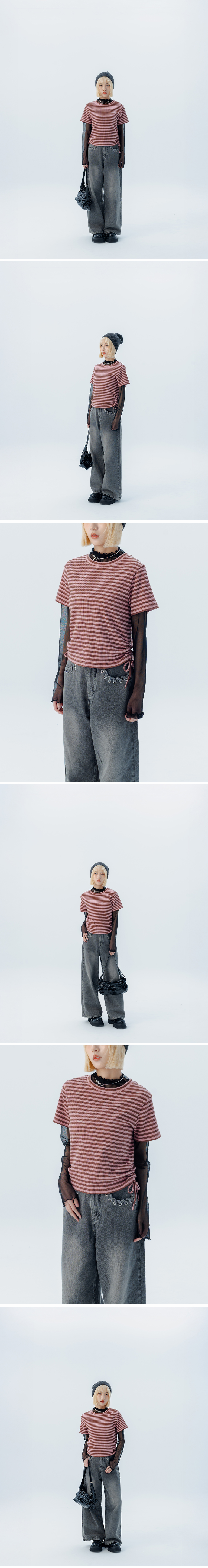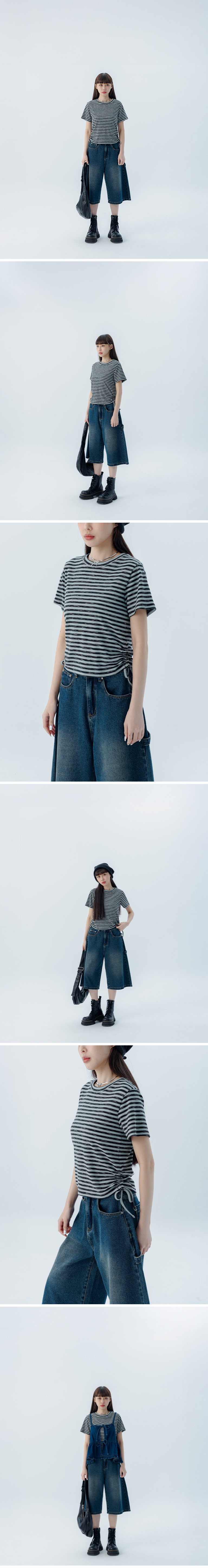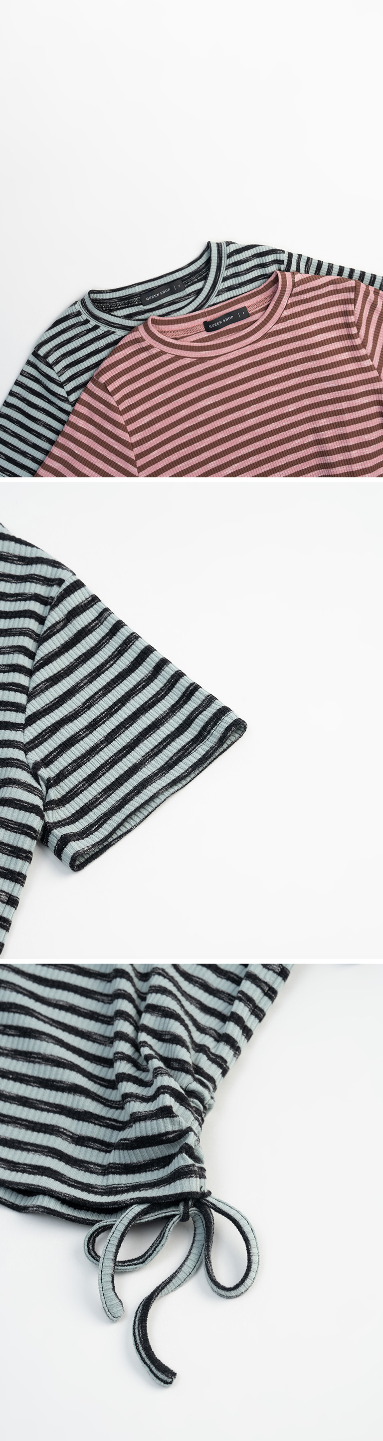 条纹刷色侧抽绳造型短袖上衣