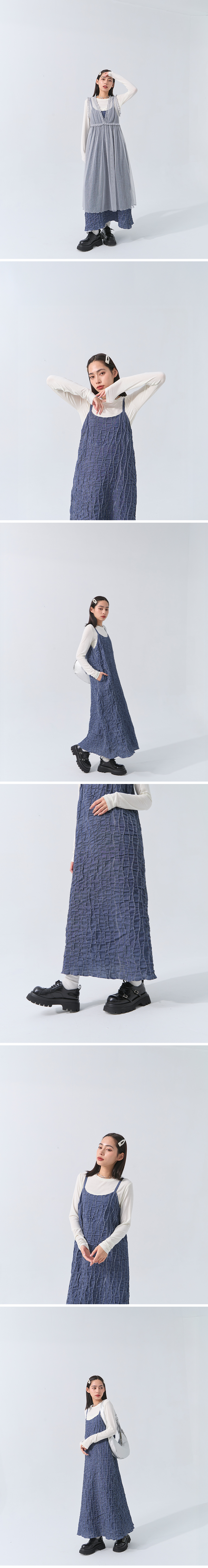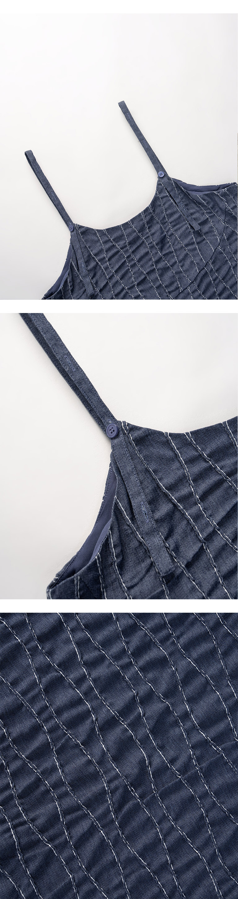 质感立体波纹绣线牛仔细肩长洋装