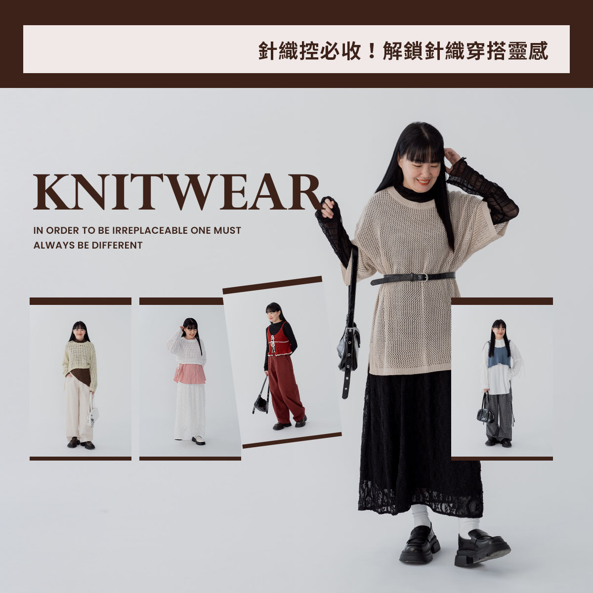 Look 1 157cm/46kg | 穿著S号 这次选用一款柔软具有垂坠度的针织宽版上衣来做搭配~短袖设计可以露出黑色皱皱内搭的袖子,更有搭配上的小巧思! 下身选择一件蕾丝长裙,下摆镂空造型让蕾丝更显眼有型~最后在腰部繫上皮带画出腰线,展现出日系气质风格Look~上衣(裡):01099136 (黑) >> 单品立即看 上衣(外):01099152 (卡其) >> 单品立即看 裙子:03021644 (黑) >> 单品立即看 Look 2 157cm/46kg | 穿著S号 初秋必备一件短版针织毛衣,下摆抽绳绑带设计可自由改变衣服轮廓,短版版型让身形比例好更显腿长! 下身搭配杏色茧型长裤,宽鬆舒适又能修饰双腿线条,最后在腰部绑个咖色针织裙帘,增添造型亮点与层次!上衣(裡):01099136 (咖) >> 单品立即看 上衣(外):01099232 (绿) >> 单品立即看 裙帘:07130035 (咖) >> 单品立即看 裤子:04101976 (杏) >> 单品立即看 Look 3 157cm/46kg | 穿著S号 秋冬的衣柜怎麽能少了红色!这套搭配以红色为主角,简单用素面上衣打底,搭一件红色针织背心就能马上穿出层次感,时髦又不费力。 下半身选择红色茧型剪裁长裤,弧形裤型可以自然修饰腿部线条,高腰设计很好地修饰整体身型比例,瞬间显高又俐落。 整体以秋冬红色系为主调,是一套穿上就让人眼睛一亮的日常造型。上衣:01099133 (黑) >> 单品立即看 罩衫:01099233 (红) >> 单品立即看 裤子:04101976 (红) >> 单品立即看 Look 4 157cm/46kg | 穿著S号 短版针织毛衣也可以展现出多种穿搭风貌!此次内加粉色中山领衬衫,露出粉色衬衫下摆,成为整套穿搭造型的小亮点~ 下身搭配带有细腻蕾丝缇花设计的白色长裙,全白的基底增添一抹粉色更显日系可爱感! 镂空感针织毛衣单穿叠穿都能轻鬆驾驭,简单一件就能创造出多风格的穿搭造型!上衣:01025671 (粉) >> 单品立即看 针织毛衣:01099232 (白) >> 单品立即看 裙子:03021644 (白) >> 单品立即看 Look 5 157cm/46kg | 穿著S号 针织背心是一年四季都合适的搭配好物~这次这款蓝色背心带有花边设计,为穿搭增添甜美俏皮气息! 下身搭配一件带有近年的流行元素之一格纹的长裤,全身蓝白搭配,跟著小编这样穿轻鬆展现时尚清新Look~上衣:01087151 (白) >> 单品立即看 背心:01150473 (蓝) >> 单品立即看 裙子:04101986 (黑) >> 单品立即看