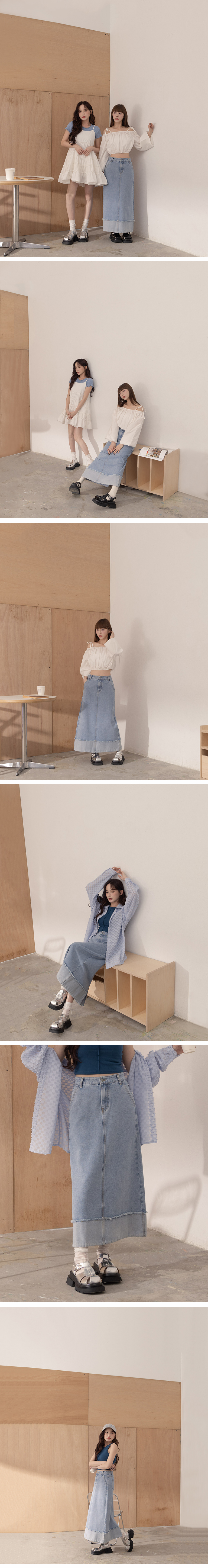 下摆反折剪接须边牛仔裙