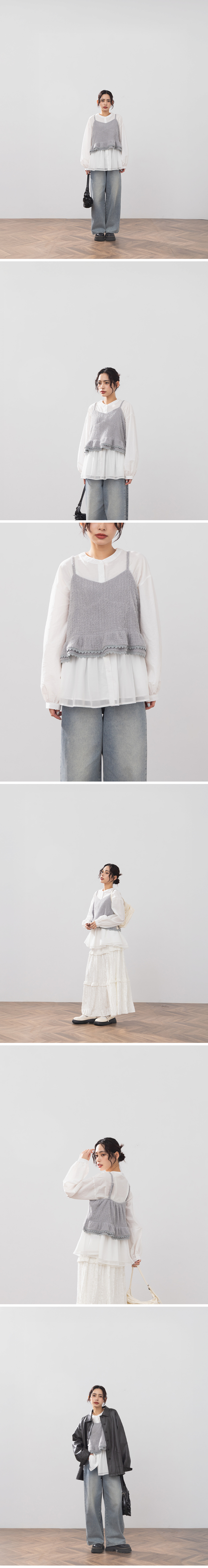 蕾丝下襬毛绒设计细肩罩衫背心-灰【01099420】现+预