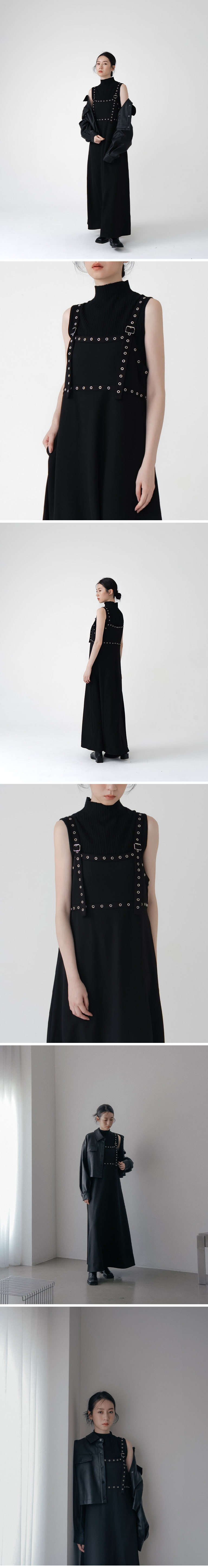 金属排扣肩带设计连身长洋装