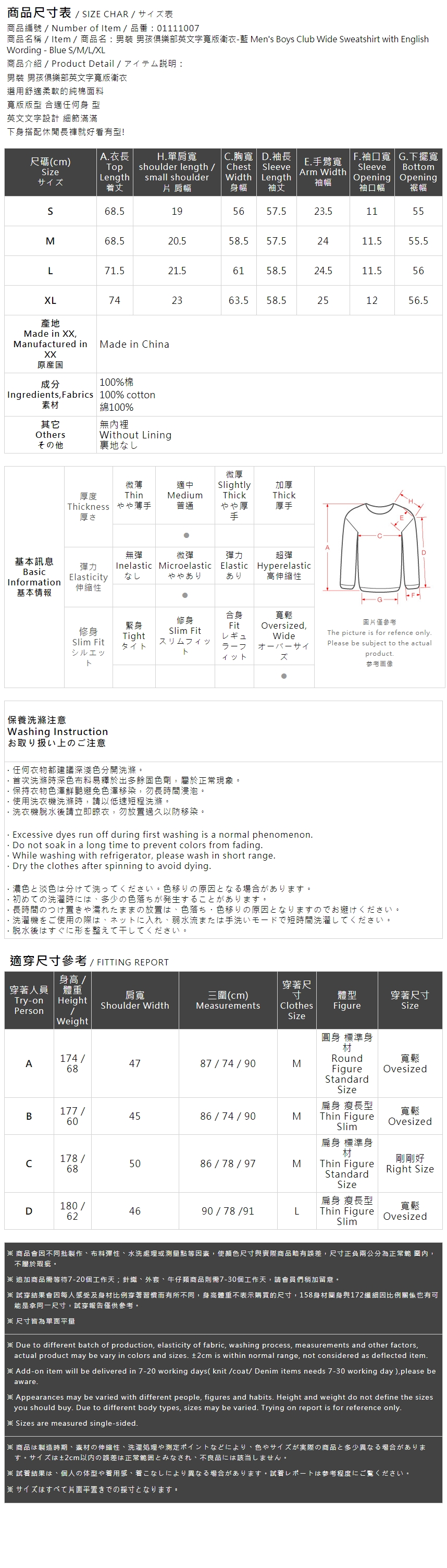 男装 男孩俱乐部英文字宽版卫衣-蓝 S/XL【01111007】现+预