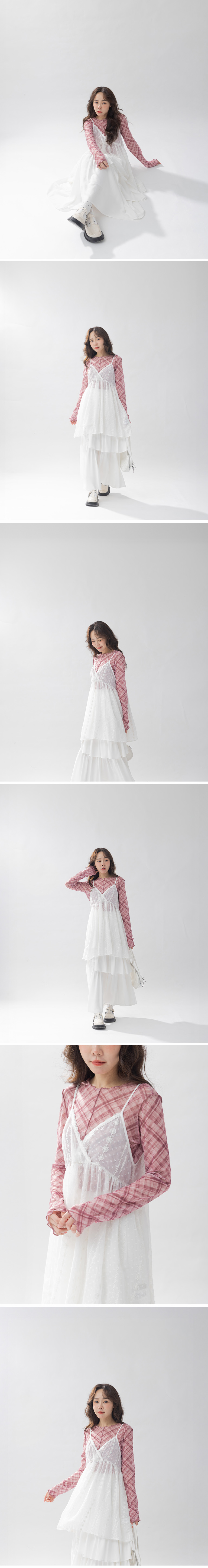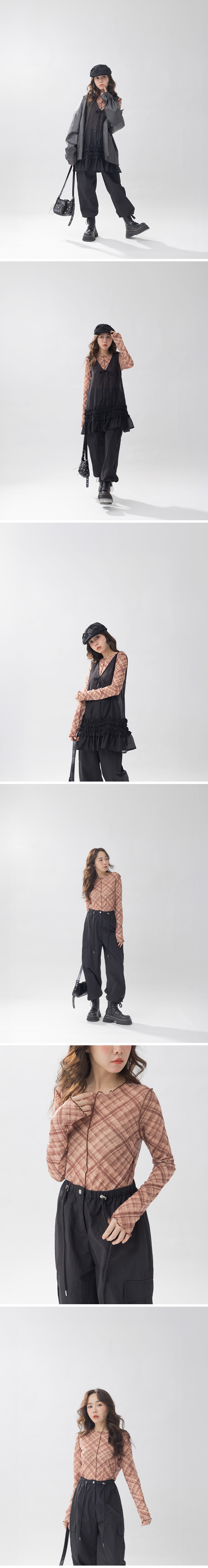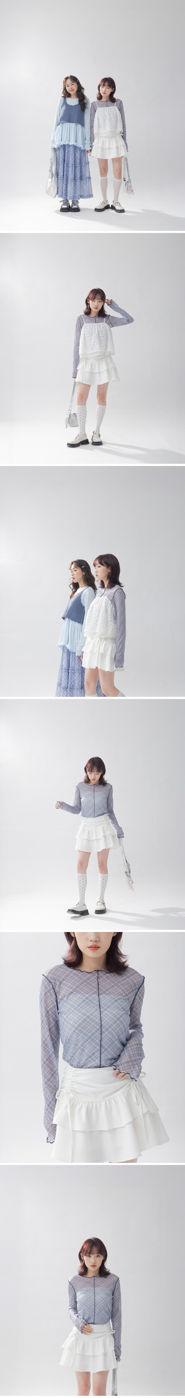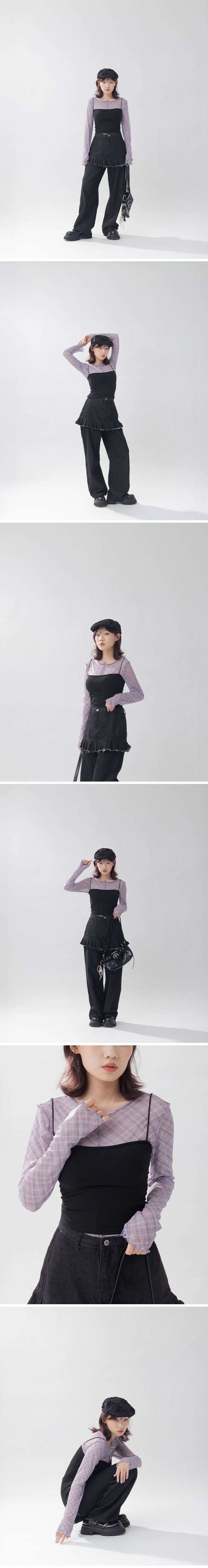 格纹造型木耳边透肤长袖上衣