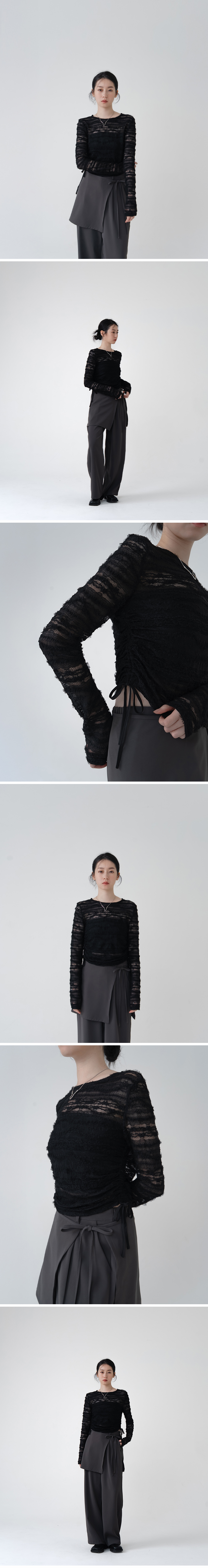 侧抽皱绑带蕾丝透肤上衣-黑