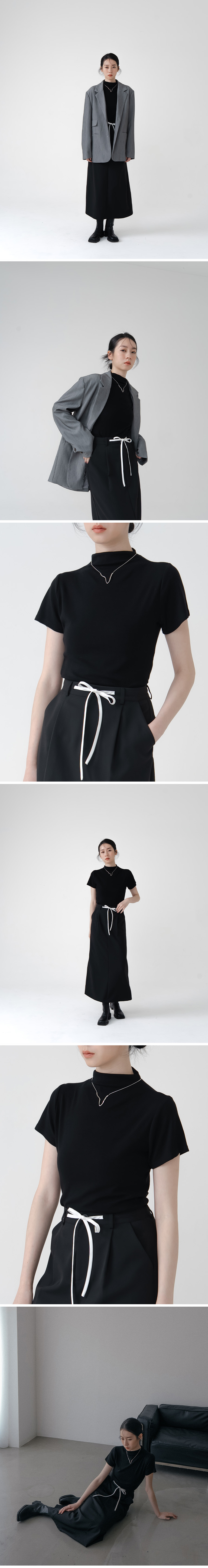 简约酒瓶领设计素面短袖上衣-黑【01099384】现+预